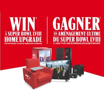 Buy Budweiser beer now and enter your pins at shopbeergear.ca/Homeupgrade for a chance to win a TV, and NFL branded fridge and recliner